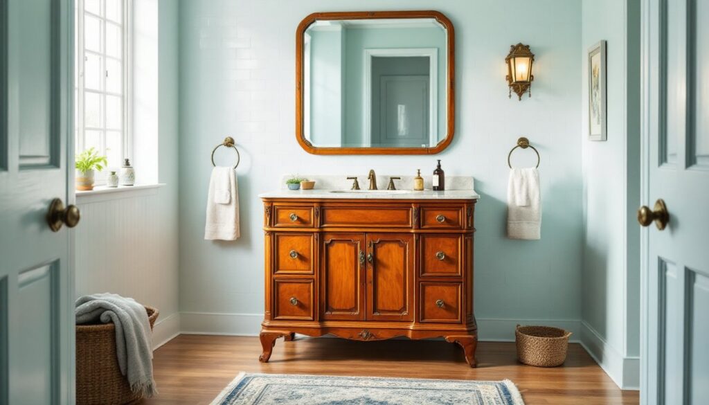 • Maintain the vintage vanity’s character and era authenticity by choosing period-appropriate hardware, stains, and finishes, while modern drop-in sinks and waterproof sealants ensure functionality and code compliance in your bathroom.